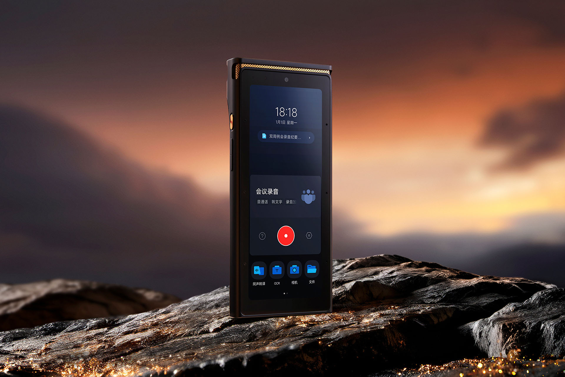 這款錄音筆採用航空鋁合金機身搭配荔枝紋皮革背蓋,質感與耐用度兼具。正面配置 5.05 吋高硬度螢幕,支援亮色與暗色模式,單手操作相當順手。機身前後皆有鏡頭,並搭載六顆全向麥克風與兩顆定向麥克風,收音效果專業。機身側邊設有紅色一鍵錄音鍵與音量鍵,底部為 Type-C 介面。整體設計結合金屬與皮革,兼具商務感與實用性。