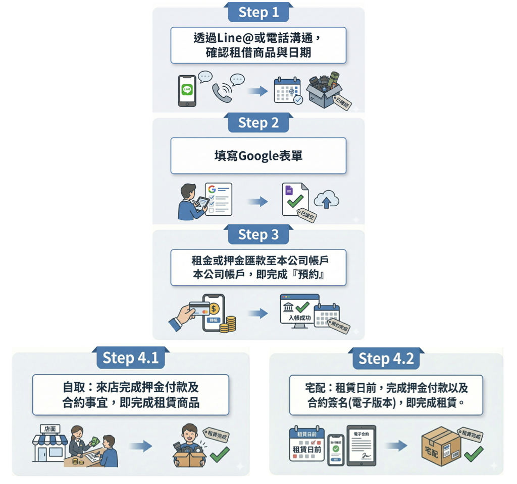 宅配:由我司宅配至指定地址,承租人自行安排宅配寄回並負擔來回運費。